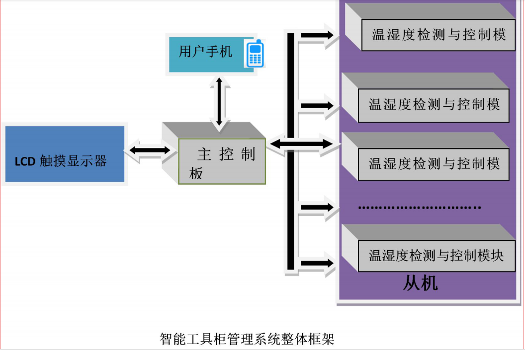 智能工具柜管理系統(tǒng)由 LCD 觸摸顯示屏、主控制板,多個(gè)從機(jī)模塊(溫濕度采集控制及工具位置信號(hào)采集)組成,具有以下功能特點(diǎn):