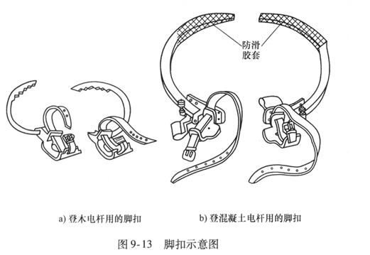 腳扣又稱鐵腳,是電工攀登電桿的主要工具。腳扣分兩種:一種扣環上帶有鐵齒,供登木桿用;另一種在扣環上裹有橡膠,供登混凝土桿用。腳扣的結構如圖9 - 13所示,用腳扣攀登電桿具有速度快、登桿方法簡便等特點。